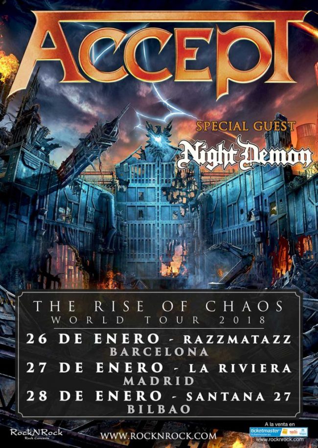 ACCEPT presentarán su nuevo trabajo en una extensa gira de invierno por toda Europa que recalará en España en el mes de enero. El grupo actuará en Barcelona (26 de enero en Razzmatazz), Madrid (27 de enero en La Riviera) y Bilbao (28 de enero en Santana 27). Tres conciertos llenos de himnos atemporales y de nuevas canciones que no tardarán en hacerse un hueco entre las favoritas de los fans del grupo alemán.
