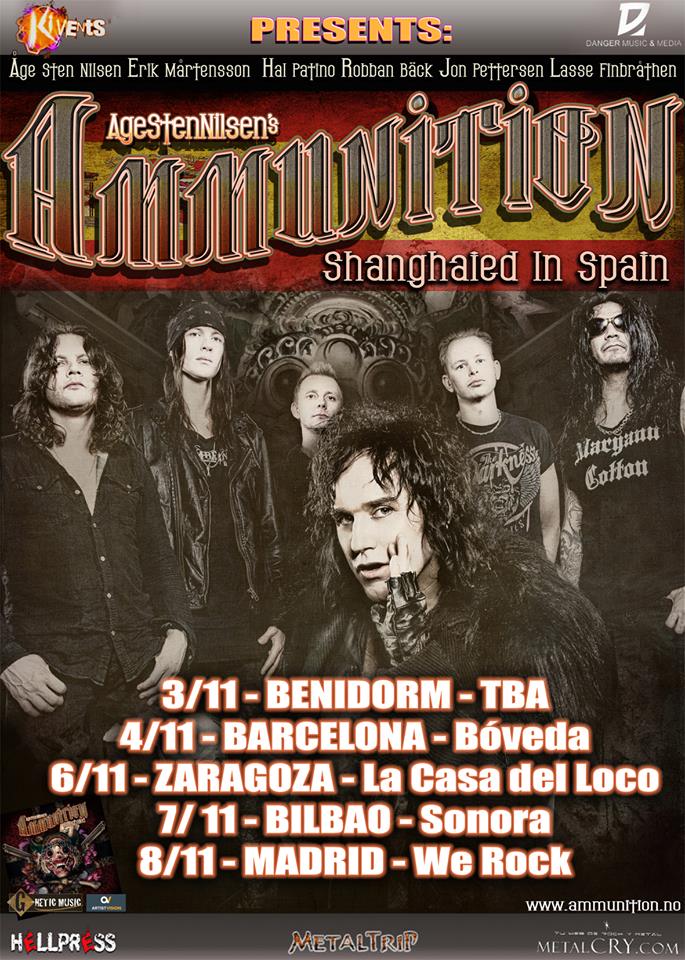 ¿Quien son Ammunition? Una súper banda con gente tan consagrada en el mundo del Rock como Åge Sten Nilsen a las voces (Wigwam / Nordic Beast), Hal Patino al bajo (King Diamond/Pretty Maids/Nordic Beast), Robban Bäck a la batería (Sabaton/Eclipse), Erik Mårtensson guitarra (W.E.T / Eclipse (Sweden)), Lasse Finbråthen a los teclados (WIG WAM/ Circus Maximus) y Jon Pettersen a la otra guitarra (Åge’s Queen show/Bad Habits).