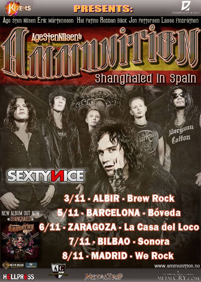 La banda liderada por el Wig Wam , Åge Sten Nilsen, llega de gira a nuestro país esta semana.Ammunition vienen a España a presentarnos su primer álbum “Shanghaied”, álbum que fue producido por el propio guitarrista de la banda Erik Martensson. (Puedes leer nuestra reseña aquí)
