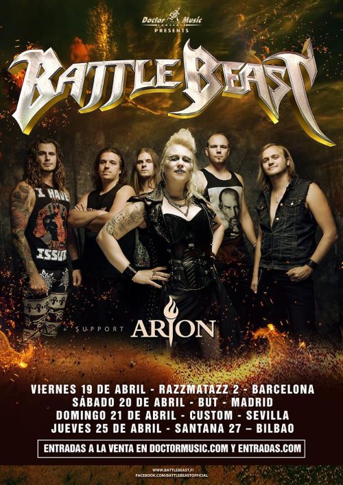 Battle Beast anuncia su próxima gira europea, en la que estarán acompañados por Arion como banda invitada. Cuatro fechas en nuestro país que incluyen el viernes 19 de abril en la sala Razzmatazz 2 de Barcelona, el sábado 20 en la sala But de Madrid, el domingo 21 de abril en la sala Custom de Sevilla y el jueves 25 en la sala Santana 27 de Bilbao.