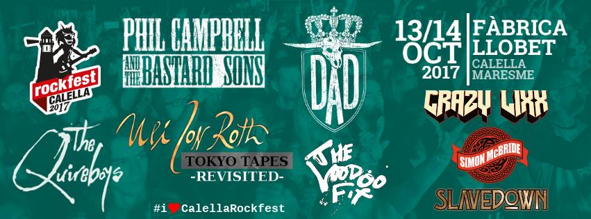 Los próximos 13 y 14 de Octubre, se celebrará en Calella (Barcelona), la 5ª edición del Calella Rockfest, una cita imprescindible para los amantes del rock. Con el aliciente de ver a Phil Campbell, el guitarrista de Motörhead durante las últimas tres décadas, hasta la muerte del gran Lemmy, o el ex-guitarrista de Scorpions Uli Jon Roth interpretando el mítico álbum «Tokyo Tapes» de la banda alemana, pasando por los espectaculares shows de los daneses D-A-D, el retorno a Calella de The Quireboys, el hard-rock de los suecos Crazy Lixx o bandas emergentes como The Voodoo Fix, Simon McBride o los gerundenses Slavedown. Un festival que cumple ya 5 años y que sigue creciendo año tras año.