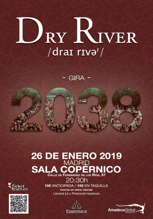 Casi un año después de que la banda castellonense presentase en Madrid su, por aquel entonces, recién estrenado «2038» en la sala Sound Stage – y con SOLD OUT- Dry River regresa a la capital. El próximo sábado 26 de enero, a partir de las 20:30h, Dry River hará sonar en la madrileña Sala Copérnico (C/ Fernández de Los Ríos, 67) todos y cada uno de los temas de su último trabajo. Las entradas anticipadas tienen un precio de 10€ -15€ en taquilla- y están disponibles en www.ticketea.com, www.ticketfever.es y en la Librería Lé y Potencial Hardcore.