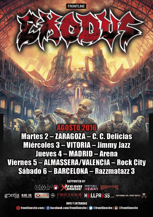 Banda seminal donde las alla, Exodus empezaron en 1979 en plena eclosión del Bay Area Thrash con Gary Holt (miembro fundador, actualmente en Slayer, y el único miembro que ha participado en todos los discos), Kirk Hammet (actualmente en Metallica) y Tom Hunting y su carrera comprende más de 30 años con discos tan importantes como «Bonded by Blood». En 2014 el grupo asiste al regreso de Seve «Zetro» Souza como cantante y es para nosotros un orgullo tenerles de vuelta por el estado presentando su nuevo disco. !Ven a verles en directo!