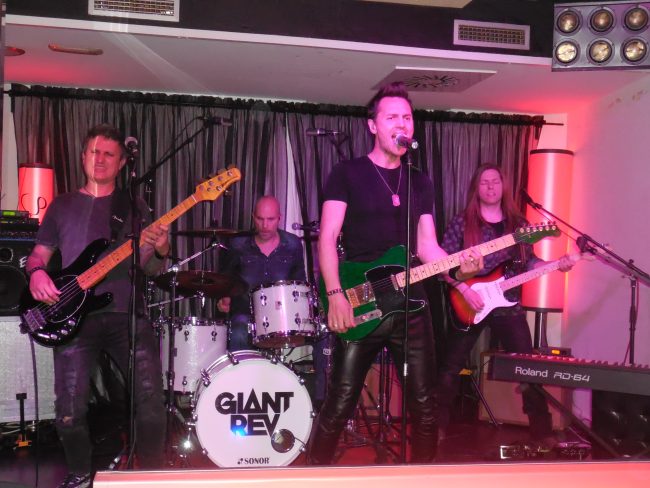 El escenario y el ambiente no eran los habituales, pero hemos de agradecer a los anfitriones que se unan a la nómina de salas en las que podemos disfrutar de un concierto de rock. Giant Rev subió al escenario pasadas las once de la noche y empalmó Born to Be Alive y Let the God Times Roll, dos de los mejores y más alegres temas de su ecléctico álbum debut. Quedó patente, desde ese mismo instante, que la banda de Barcelona iba a sonar exactamente como el disco, merced a su enorme calidad y a un buen uso de los efectos de guitarra y bajo para los temas que lo requieren. También se evidenció una de las características de la formación : son músicos experimentados que han interpretado temas de muchos otros y que tienen influencias variadas. Por ello, cuando crean, lo hacen con total libertad y sin aprioris. Son eclécticos hasta en sus orígenes, como demostraron en las versiones que interpretaron : mi adorado Baba O’Riley de The Who, Vasoline de Stone Temple Pilots, Live and Let Die de Wings y My Melancholy Blues de Queen. Todos ellos perfectamente ejecutados al estilo Giant Rev. El último, apoyado en la facilidad de Pau para cantar al estilo Mercury, introdujo el tema final del concierto, que no fue otro que su superhit Little Beast, que a mí, personalmente, es el que más me gusta, ya que, con un Pau magistral al piano y a la voz, exhibe la perfecta combinación de calidad, matices y fuerza que la banda puede ofrecer.