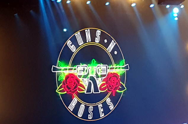 Ahora se trataba de ver cuánto tardaban en aparecer Guns N’ Roses. ¿Seguiría Axl Rose con su lamentable manía de hacer esperar horas a los fans? Los que habían ido el viernes decían que no habían empezado hasta la media noche, con hora y media de retraso. Pero al parecer, Alice In Chains habían salido a las diez con un retraso de media hora, por lo que GNR se habrían retrasado a su vez otra media hora, contando con el tiempo que se tarda en adaptar el escenario al finalizar los teloneros. No era para tanto. Y esta vez nadie se retrasó. Apenas unos minutos sobre las 11 de la noche sonó la melodía de Looney Tunes y allí apareció Axl Rose con su pie escayolado tras romperse un dedo del pie en su actuación en el Troubadour, sentado en el famoso trono de Dave Grohl, y junto a él, Duff McKagan y Slash, acompañados por Frank Ferrer y Richard Fortus, batería y guitarra de la anterior encarnación de GNR que fueron responsables de buena parte de la potencia con que se desempeñó la banda, así como Dizzy Reed y Melissa Reese a los teclados.
