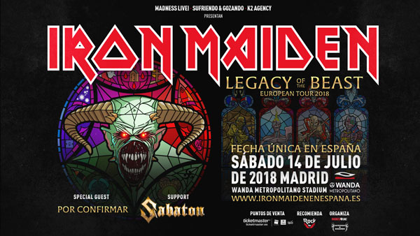 Tras el espectacular éxito de la gira internacional de 2016-17 para presentar su decimosexto álbum de estudio, The Book Of Souls, IRON MAIDEN se echará de nuevo a la carretera en 2018 para dar una serie de conciertos en festivales y estadios de Europa dentro de la gira mundial «Legacy Of The Beast» que comenzará en Tallin (Estonia) el 26 de mayo y finalizará el 10 de agosto en el o2 Arena de Londres. Esta única fecha en España, tendrá lugar el próximo sábado 14 de Julio de 2018 en el Estadio Wanda Metropolitano de Madrid.