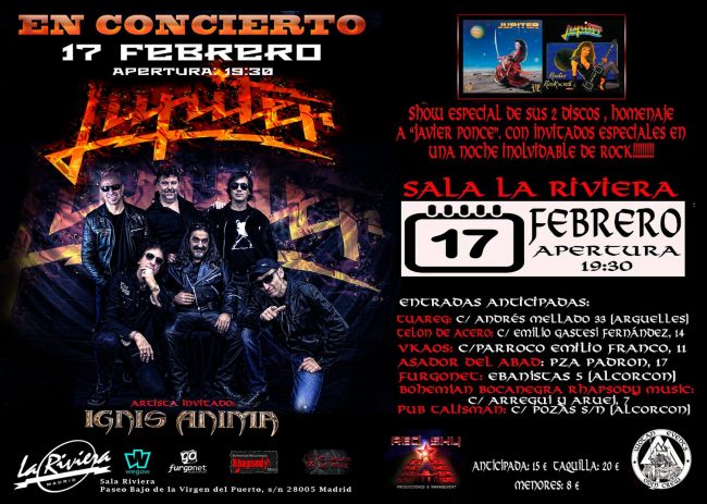 La vuelta a los escenarios de la mítica banda de los 80 Júpiter, show exclusivo de sus 2 discos, que servirá de homenaje a su guitarra fallecido Javier Ponce, la banda original y Javier Mira, junto a invitados de las bandas más grandes del rock. Junto a la participación como artista invitado de uno de los grupos emergentes del momento Ignis Anima.