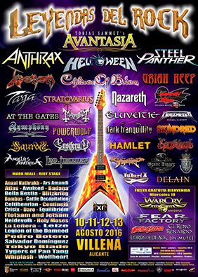 La decimoprimera edición del festival Leyendas del Rock se celebrará los días 10, 11, 12 y 13 de agosto de 2016 en Villena (Alicante). Más de 60 bandas procedentes de todo el planeta conforman un poderoso cartel donde todas las variantes del rock y el heavy metal tienen representación. Leyendas del Rock se realiza en el Polideportivo Municipal de Villena, un recinto realmente espectacular, dotado de césped natural, piscinas, zonas arboladas, fácil acceso y muchas comodidades. Contaremos asimismo con la habitual fiesta gratuita de bienvenida, ludoteca, gradas, parking gratuito, zona de acampada, acústicos en el centro de la ciudad, actuaciones en el camping y muchas más sorpresas.