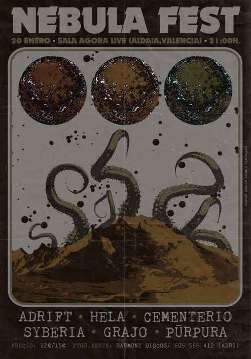 Encabezando la noche estará la banda tótem en lo que a Post Metal se refiere dentro de la península, los madrileños Adrift. La noche la completara el Doom ultra pesado de los cordobeses Grajo, el Sludge salvaje de los locales Cementerio, el delicado Post Rock de los maestros Syberia, el refinado Doom de los alicantinos Hela, y el intrincado Post de los novedosos Purpura. Un coctel perfecto, para los amantes de los sonidos contemporáneos del Metal, que conseguirá englobar en una sola noche, algunas de las bandas más imaginativas del reciente panorama estatal.