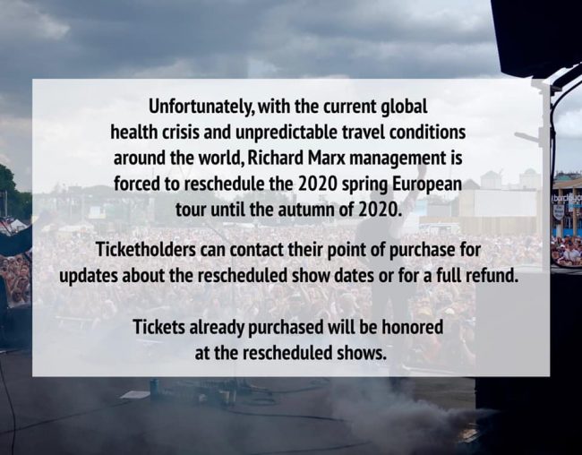 Para garantizar la salud y la seguridad de mis fans que asisten a los espectáculos, la próxima gira europea debe reprogramarse debido a la crisis de salud mundial. Estoy muy agradecido a mis admiradores y estaba tan emocionado por una increíble gira europea. Estos shows se agotaron durante meses y estaba listo para tener una increíble noche de música con todos. ¡Volveré pronto y lo pasaremos increíble!
