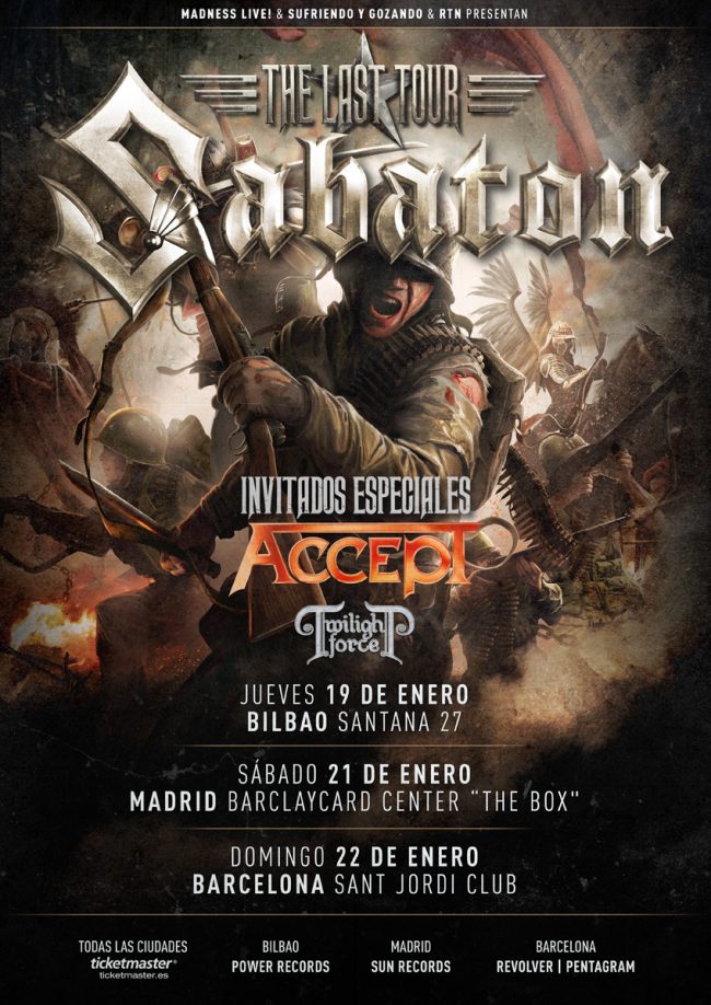 El año comienza con uno de los conciertos más espectaculares que podremos vivir a lo largo de todo el 2017. Nada más y nada menos, que Sabaton presentando su último “The Last Stand”, y las leyendas germanas Accept, haciéndoles las veces de teloneros de lujo junto a los nordicos Twilight Force. Pocos pueden imaginarse un plantel más rotundo que este. Por un lado, los míticos padres del Metal Alemán viviendo una segunda juventud tras un par de discos exitosos y por otro, la consagración definitiva del conjunto encargado de darles el relevo.