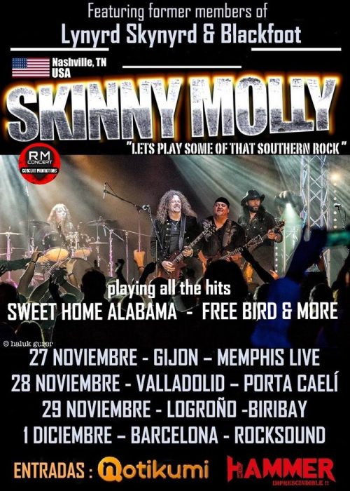 Vienen Skinny Molly la veterana superbanda de Rock del sur de Nashville, Tennessee. Se formaron en 2004 de mano del guitarrista/cantante Mike Estes (guitarra de Lynyrd Skynyrd y Blackfoot) al que se le sumaron Dave Hlubek (guitarrista y miembro fundador de Molly Hatchet) y Kart Pietro (batería de TN estudio).