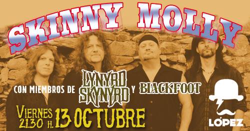 SKINNY MOLLY desde Nashville (Tennesse) una de las grandes bandas de rock sureño. Fundada en 2004 el guitarrista/cantante Mike Estes (guitarra de Lynyrd Skynyrd y Blackfoot), Dave Hlubek (guitarrista y miembro fundador de Molly Hatchet) y batería Kurt Pietro. Hlubek regreso en 2005 a Molly Hatchet y en ese momento fue sustituido por el guitarrista/cantante Jay Johnson (proveniente de The Rossington Band y Blackfoot). El grupo lo cierra el magnífico bajista Luke Bradshaw conocido por haber formado en Nashville Bluegrass y Grand Ole Opry.