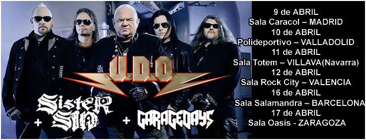 Los alemanes UDO vendrán acompañados en esta gira por los suecos Sister Sin y los austriacos Garagedays que unen sus fuerzas para ofrecer una gran noche de metal. ¿Te lo vas a perder?