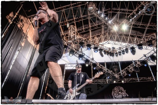 Por suerte los acoples en el sonido fueron pocos y únicamente durante el primer tema, eso sí, con lo bien que estaba sonando y tiene que ser precisamente con “Neighbor” cuando pase algo, pero no voy a ser puntilloso, fue muy poca cosa y se solucionó al instante. Whitfield es una bestia sobre las tablas, se llevó a todo el público de calle y a pesar de no parar quieto vocalmente estuvo soberbio. Antes de presentar “No one survive” recordó su última visita a nuestro país hace alrededor de 22 años y agradeció al público español el haberles mantenido vivos, y es que realmente con tan solo quince minutos yo también tenía esa sensación. No me hubiera podido imaginar que hubiera tanta gente con ganas de ver a Ugly Kid Joe en la actualidad, incluso pude charlar con un chaval que había venido desde el sur de España únicamente por verlos a ellos.
