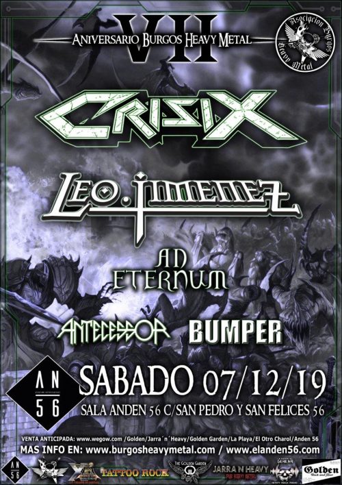 En esta ocasión, por cuestiones logísticas ajenas a la asociación, no ha sido posible reeditar el formato de dos días por lo que el evento tendrá lugar el próximo 7 de diciembre en la nueva Sala Andén 56 de la localidad burgalesa. Esas mismas cuestiones logísticas también han impedido que el cartel contase con una banda internacional acorde con el evento y sus anteriores ediciones y progresión, por lo que se ha apostado por una mezcla entre bandas locales, una nacional de gran proyección y dos de las bandas más importantes de la escena nacional actual. Los locales ANTECESSOR serán los encargados de abrir el evento con su mezcla de thrash, groove e incluso death y nos presentarán, entre otros, su aclamado álbum “Ex libris”, editado este mismo año. A continuación, el reconocido baterista burgalés BUMPER y su banda del mismo nombre ofrecerán su veteranía y amplísima experiencia en el mundo del rock y el heavy metal. Desde Vizcaya nos visitarán por primera vez Ad Eternum, quienes nos ofrecerán trallazos de auténtico Heavy Metal pertenecientes a su hasta ahora único disco “Dogma”. Una de las más importantes y versátiles voces del heavy metal patrio se subirá al escenario del Andén 56 para repasar su extensa carrera y presentar en Burgos su disco “Mesías” (2019). El aclamado, y muy solicitado, LEO JIMENEZ será uno de los platos fuertes del aniversario. Y por último una de las bandas con mayor proyección internacional del país, con una carrera meteórica que les ha llevado a participar en los festivales más importantes de Europa y Norteamérica. Precisamente recién aterrizados de Estados Unidos los thrashers catalanes CRISIX vuelven a los brazos de la asociación, esta vez en gran formato, acorde a su actual estatus de banda de reconocido prestigio. Os esperamos a todos deseando que disfrutéis de una gran noche de Heavy Metal.