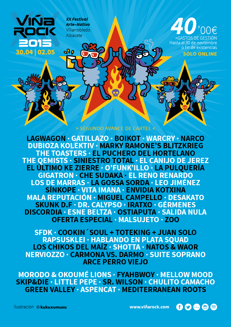 Un total de 35 artistas que se unen al cartel de Viña Rock 2015, entre los que se encuentran Lagwagon, Gatillazo, Dubioza Kolektiv, Marky Ramone’s Blitzkrieg, The Toasters, The Qemists, El Canijo de Jerez, El Último Ke Zierre, O’Funk’illo, Gigatron, Che Sudaka, Los de Marras, Vita Imana, Mala Reputación, Miguel Campello, Skunk D.F, Dr. Calypso, Gérmenes, Discordia, Ostiaputa, Salida Nula, Oferta Especial, Malsujeto y Zoo.