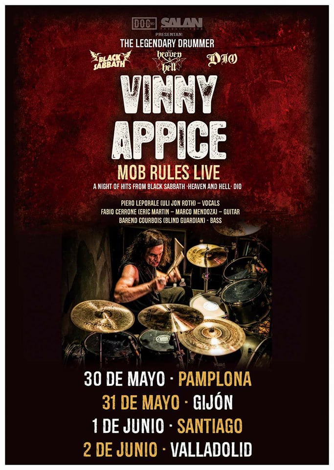 Tras la salida de Dio de Black Sabbath, Vinny sigue su estela y con la nueva banda DIO es donde graba los discos (Holy diver, Last in line, Sacred heart, Intermission y Dream evil) que serán un legado irrepetible para el hard rock. Tras su paso por Wold War III , un fugaz regreso a BLACK SABBATH junto a Ronnie James Dio para grabar (Deshumanizer) y una nueva vuelta a DIO con dos nuevos discos (Strange highways y Angry machines), colaboraciones de todo tipo con grandes artistas y proyectos desembarcan en el nuevo proyecto de Dio y Tomy Iommi HEAVEN & HELL (The devil you know) con excelentes críticas. Tras la muerte de Ronnie y disolución del proyecto,  Vinny Appice se embarca en un ambicioso proyecto con la formación clásica y original de DIO llamada LAST IN LINE donde giran mundialmente tocando los clásicos de DIO y de su nuevo disco (Heavy crown) obteniendo un extraordinario éxito y combinándolo hasta hoy con su nuevo proyecto VINNY APPICE MOB RULES LIVE en el que se rodea con excelentes músicos de categoría como PIERO LEPORALE en las voces (Uli Jon Roth), FABIO CERRONE a la guitarra (Eric Martín – Marco Mendoza) y el gran BAREND COURBOIS al bajo (Blind Guardian) donde tocará los grandes clásicos de sus tres grandes bandas (BLACK SABBATH, DIO, HEAVEN & HELL) una oportunidad única y exclusiva de degustar estos temas en directo de nuevo de la mano de uno de los más relevantes y genuinos percusionistas que siguen siendo claves para seguir escribiendo la historia del rock !
