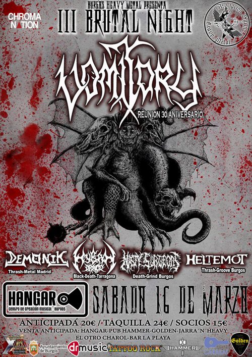La Asociación Burgos Heavy Metal, cuyo principal objetivo es la promoción de eventos relacionados con el Metal en Burgos, sigue creciendo poco a poco… ¡y en lo relativo a Metal Extremo no iba a quedarse atrás! La leyenda del Death Metal VOMITORY será la encargada de encabezar la tercera Brutal Night en la Sala Hangar de la capital castellana el sábado 16 de marzo. La mítica banda sueca se separó en 2013 pero después de un concierto homenaje a un viejo amigo en el Festival alemán Summer Breeze 2017 decidieron que había llegado el momento de volver a los escenarios. Y que mejor ocasión que 2019 cuando se cumplen ni más ni menos que treinta años de la fundación de la banda. Trallazos como Revelation Nausea o Blood Rapture volverán a sonar por todo el mundo incluyendo una gira española con sólo tres fechas peninsulares, una de las cuales será precisamente la Brutal Night burgalesa. El cartel lo completan los tarraconenses HYBAN DRACO, los madrileños DEMONIK y los burgaleses NASTY SURGEONS y HELTEMOT en lo que promete ser una noche para el recuerdo.
